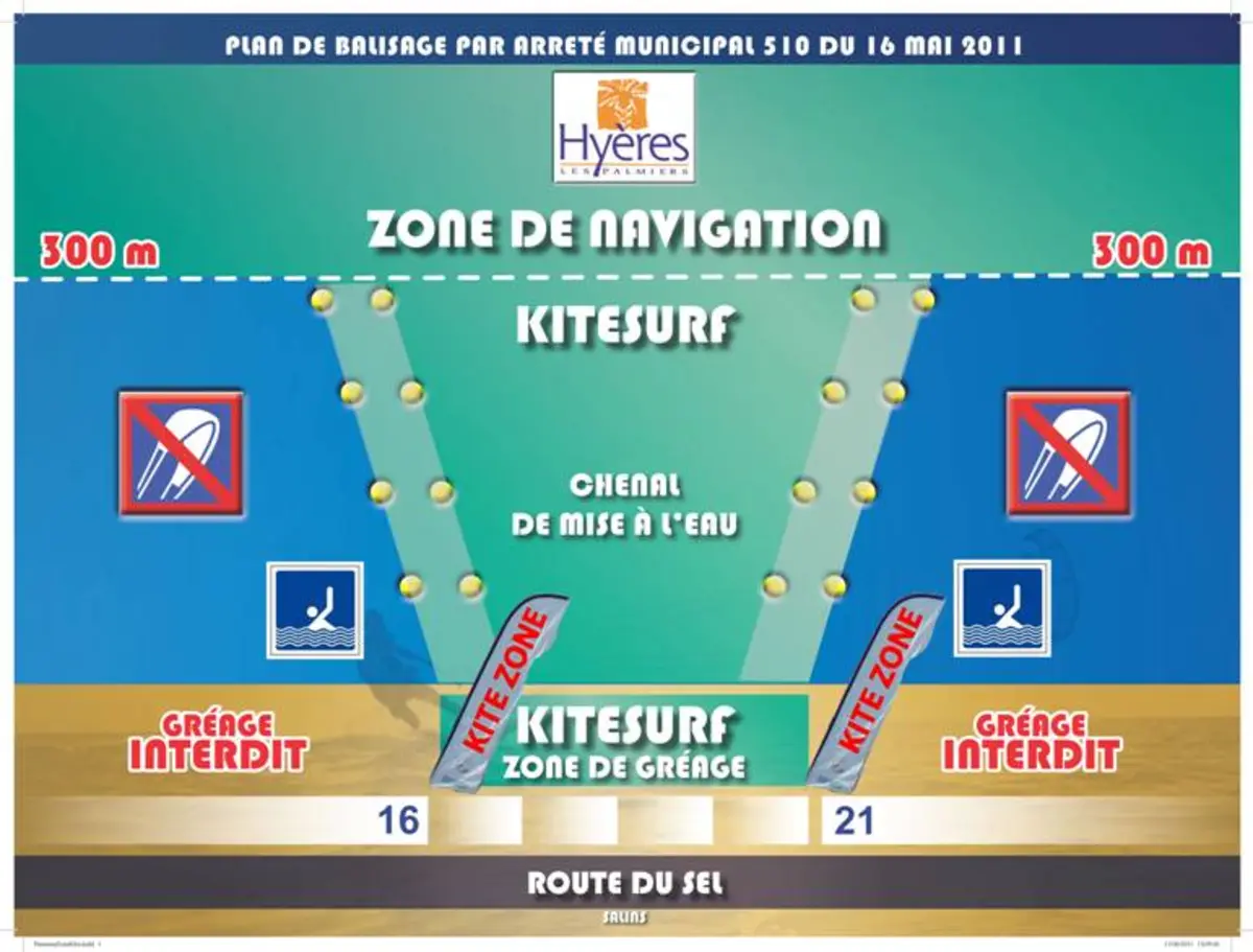 En été la mise à l'eau se fait sur une zone réduite de la porte 16 à 21. Il y a aussi un chenal de sortie que vous devrez prendre pour atteindre la zone des 300m. Hors saison, toute la baie est ouverte, mais c'est quand même conseillé de partir de la zone de kite. Evitez le coin où les windsurfeurs se mettent à l'eau, ils ont du cacartère dans la région.